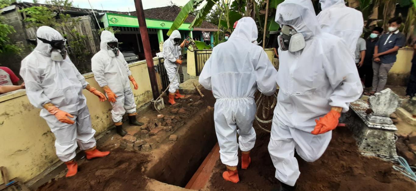 Pendowoharjo---- Giat pemakaman jenazah secara prokes Jumat (16/07/2021) sore dilakukan di RT 16 Padukuhan Krandohan atas M, laki-laki warga RT 16 yang meninggal di rumah. Rukti dilakukan oleh tim dari RS PKU Muhammadiyah Bantul.