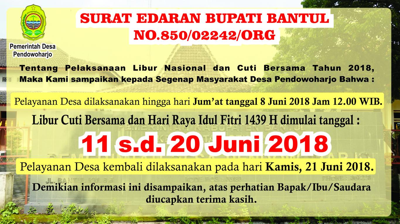 Pendowoharjo--- Berdasarkan Surat Edaran Bupati Bantul No.850/02242/ORG Tentang Pelaksanaan Hari Libur Nasional dan Cuti Bersama Tahun 2018, Maka kami sampaikan kepada segenap masyarakat Desa Pendowoharjo bahwa pelayanan Desa libur dari tanggal 11, 12, 13, 14, 18, 19, 20 Juni 2018 dikarenakan cuti bersama dan libur tanggal 15 dan 16 Juni 2018 karena Libur Hari Raya Idul Fitri. Pelayanan Desa kembali dibuka hari Kamis, 21 Juni 2018. Demikian informasi ini disampaikan, atas perhatian Bapak/Ibu/Sdr diucapkan terima kasih.