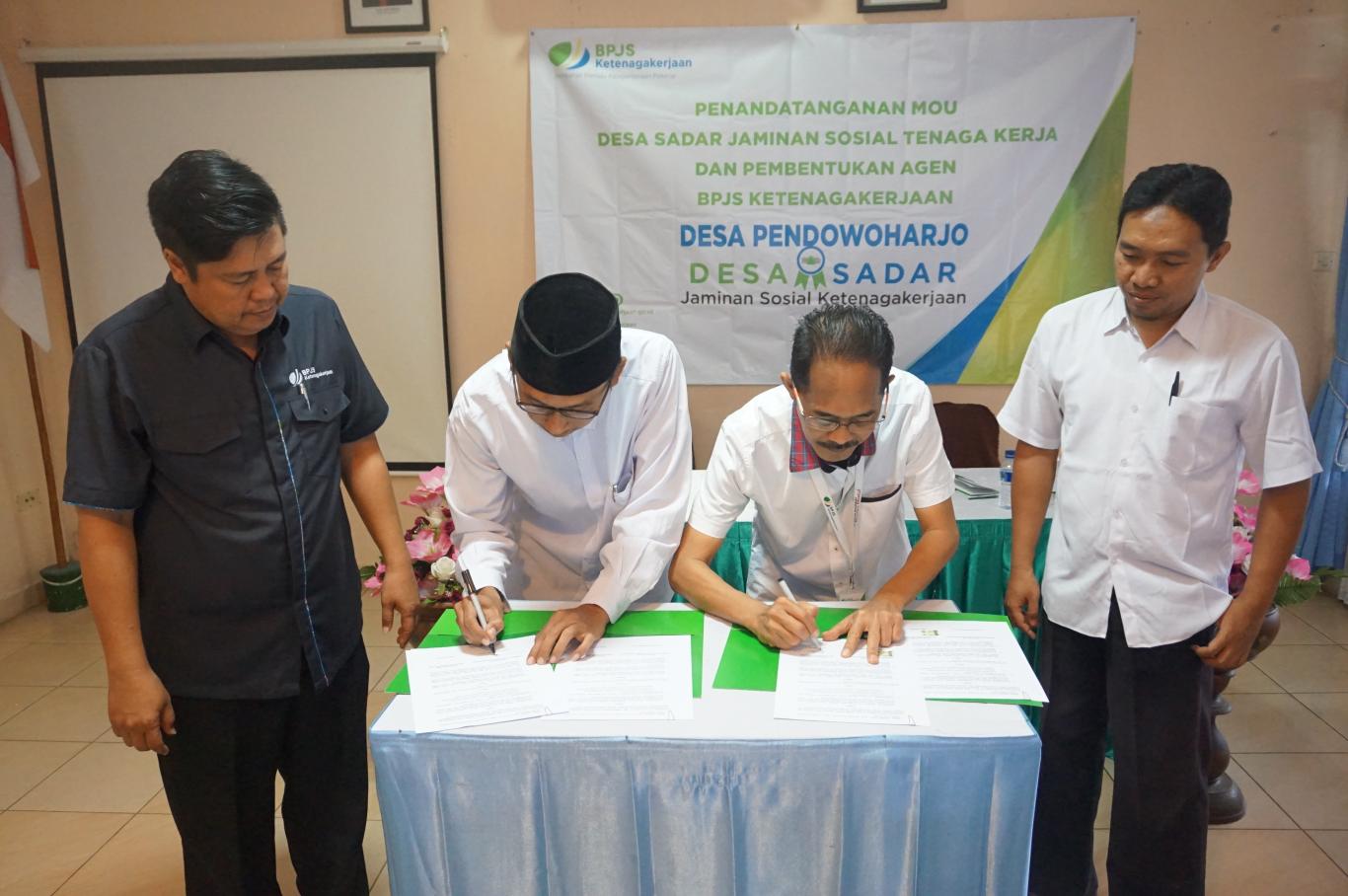 Pendowoharjo--- Siang tadi (31/08/2018) Pemerintah Desa Pendowoharjo melakukan kerjasama dengan BPJS Ketenagakerjaan Kabupaten Bantul. Hal tersebut dilakukan dengan penandatanganan MoU atau nota kesepahaman bersama bahwa Desa Pendowoharjo terpilih sebagai Desa Sadar Jaminan Sosial Ketenagakerjaan. Dalam kegiatan tersebut juga diundang Lurah Desa, Kasi, Kaur, Dukuh dan sebagian staf desa yang dilangsungkan di Rumah Makan Parangtritis.