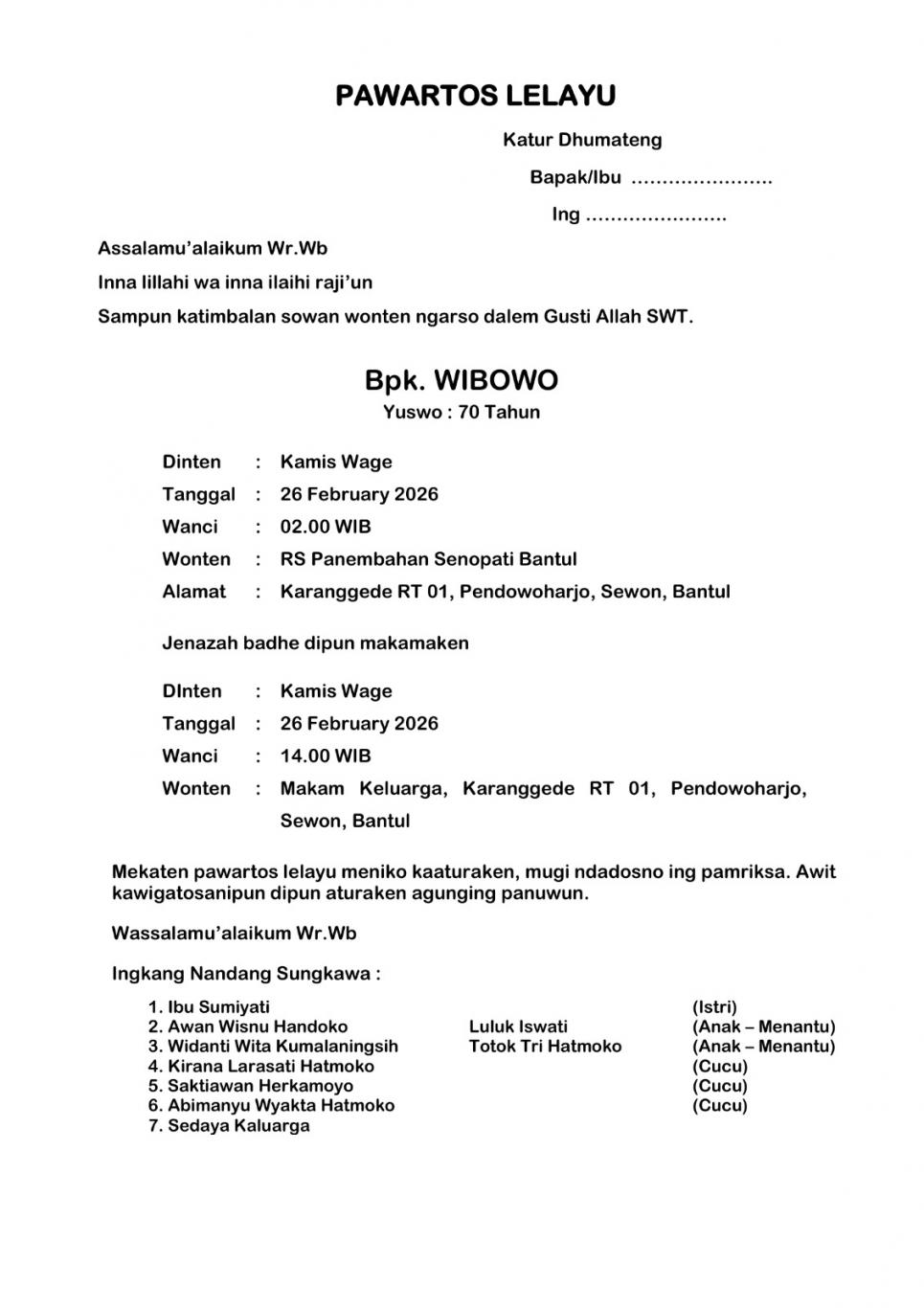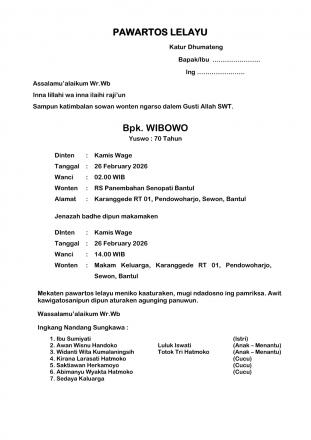 Almarhum Wibowo adalah mantan anggota sekaligus mantan Ketua Bamuskal tahun 2017. Meninggal pada hari Kamis Wage (26/02/2026) di RS panembehan Senopati dan dikebumikan hari itu juga di makam keluarga Karanggede RT 01. Semoga seluruh amal ibadahnya diterima Tuhan Yang Maha Esa serta dimaafkan semua kesalahannya. Aamiin. (may)