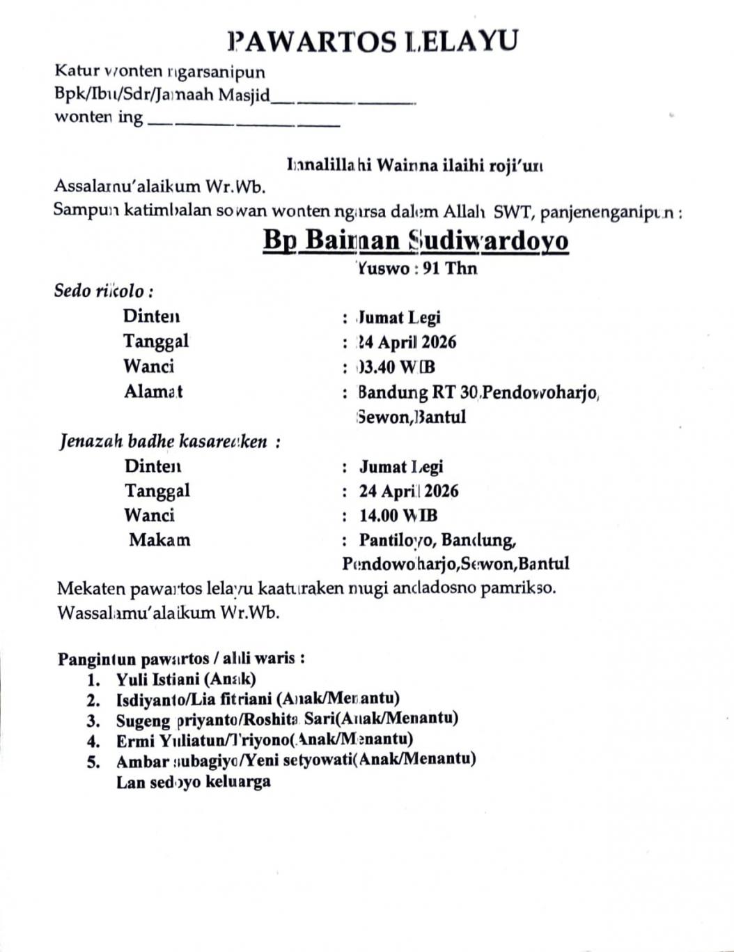 PENDOWOHARJO---- Pemerintah Kalurahan Pendowoharjo menyampaikan turut berduka cita atas meninggalnya ayahanda Bamuskal keterwakilan wilayah Bandung dan Ngaglik (Isdiyanto) atau alm Baiman Sudiwardoyo yang meninggal pada usia 91 tahun. (may)